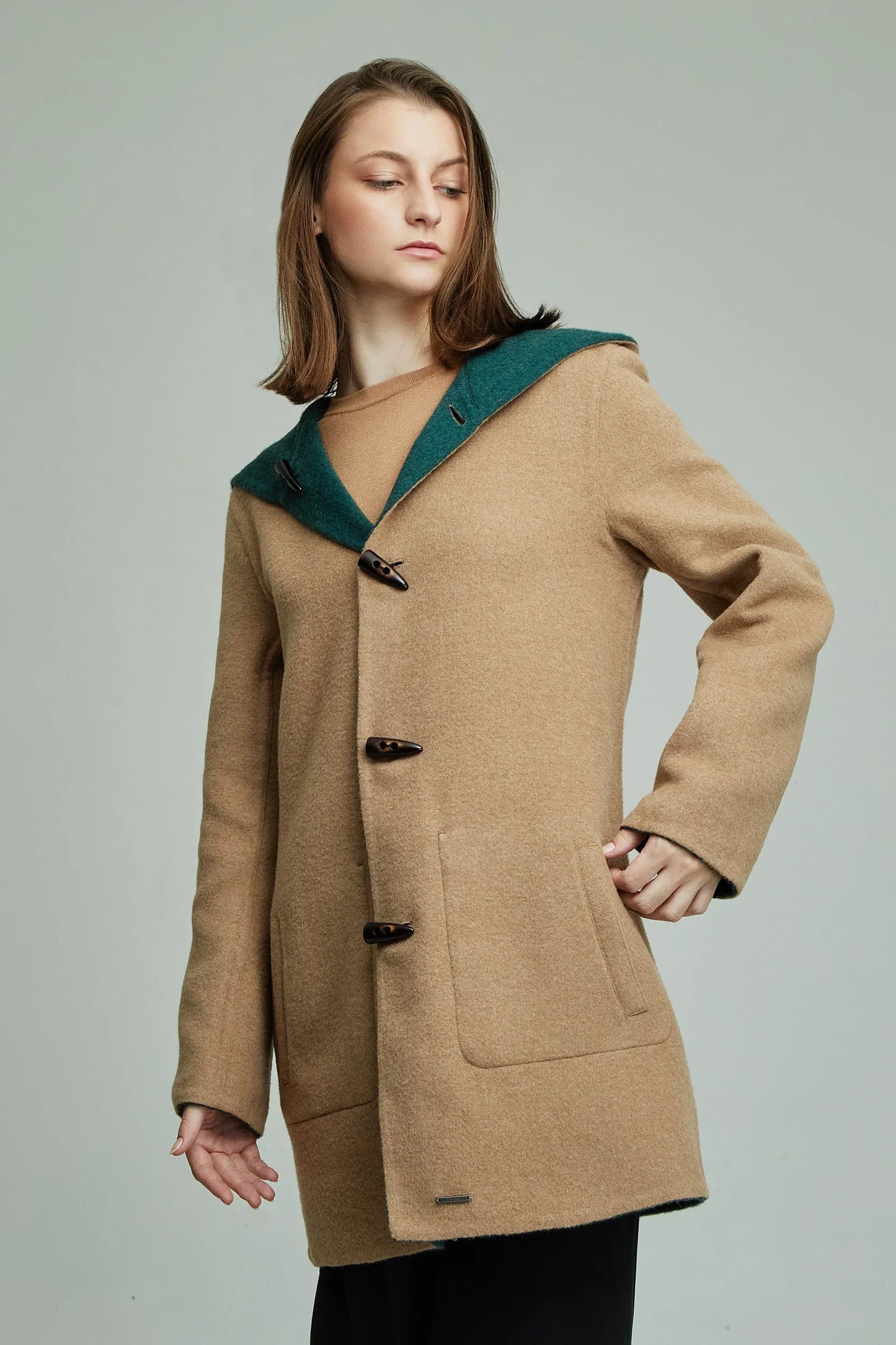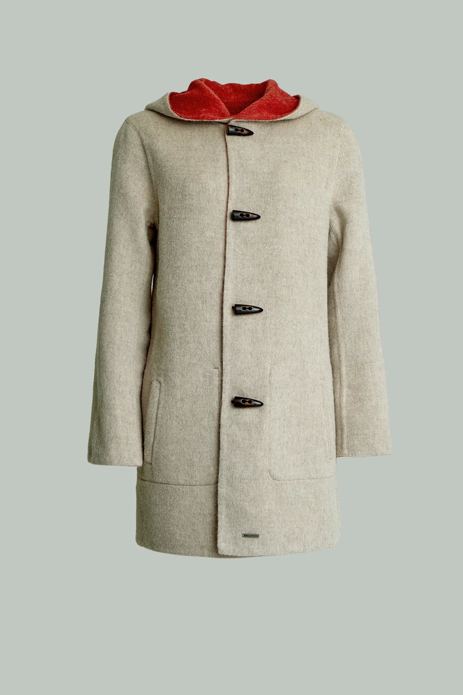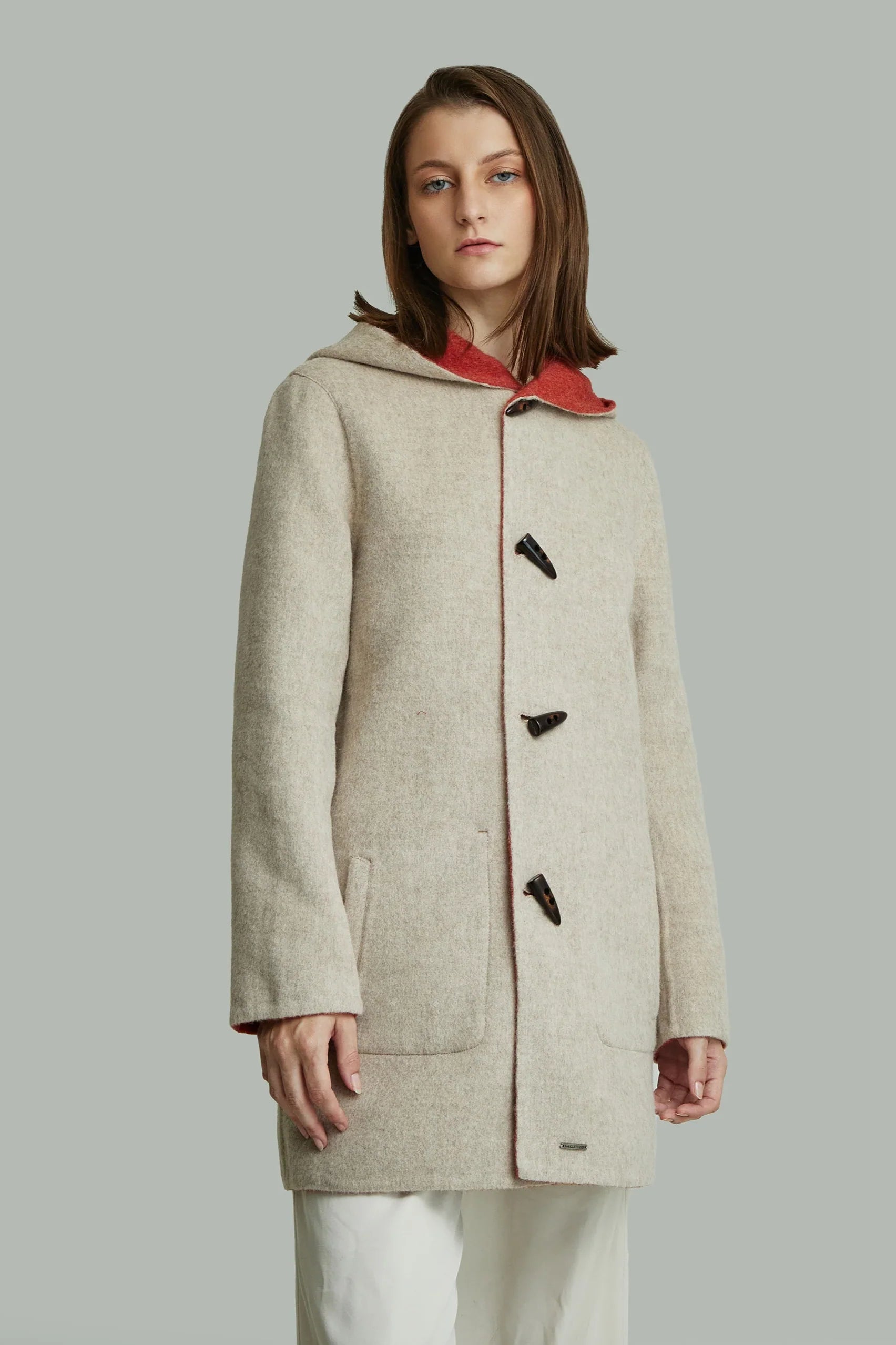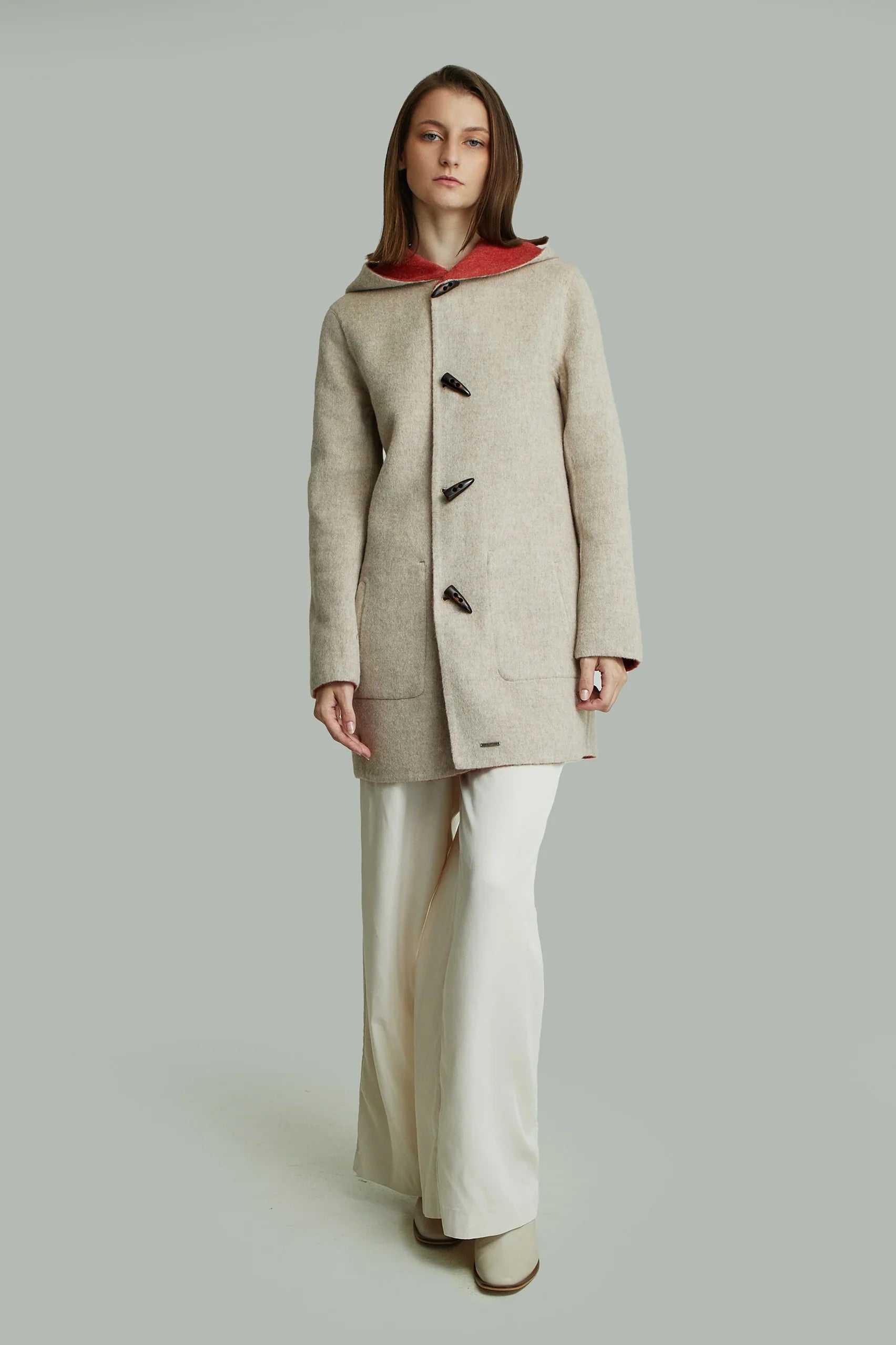 This luxurious and versatile women's reversible hooded coat is a must-have piece for any wardrobe. Crafted from soft, sustainable Baby Alpaca fabric, it provides exceptional warmth, hypoallergenic properties, and unparalleled softness. This coat features beautiful horn buttons and showcases stunning craftsmanship. One of our best-selling Alpaca coats, it has been updated with fresh seasonal colors, offering you two coats in one with its reversible two-tone design. The stylish hood adds extra comfort, making it perfect for any occasion.