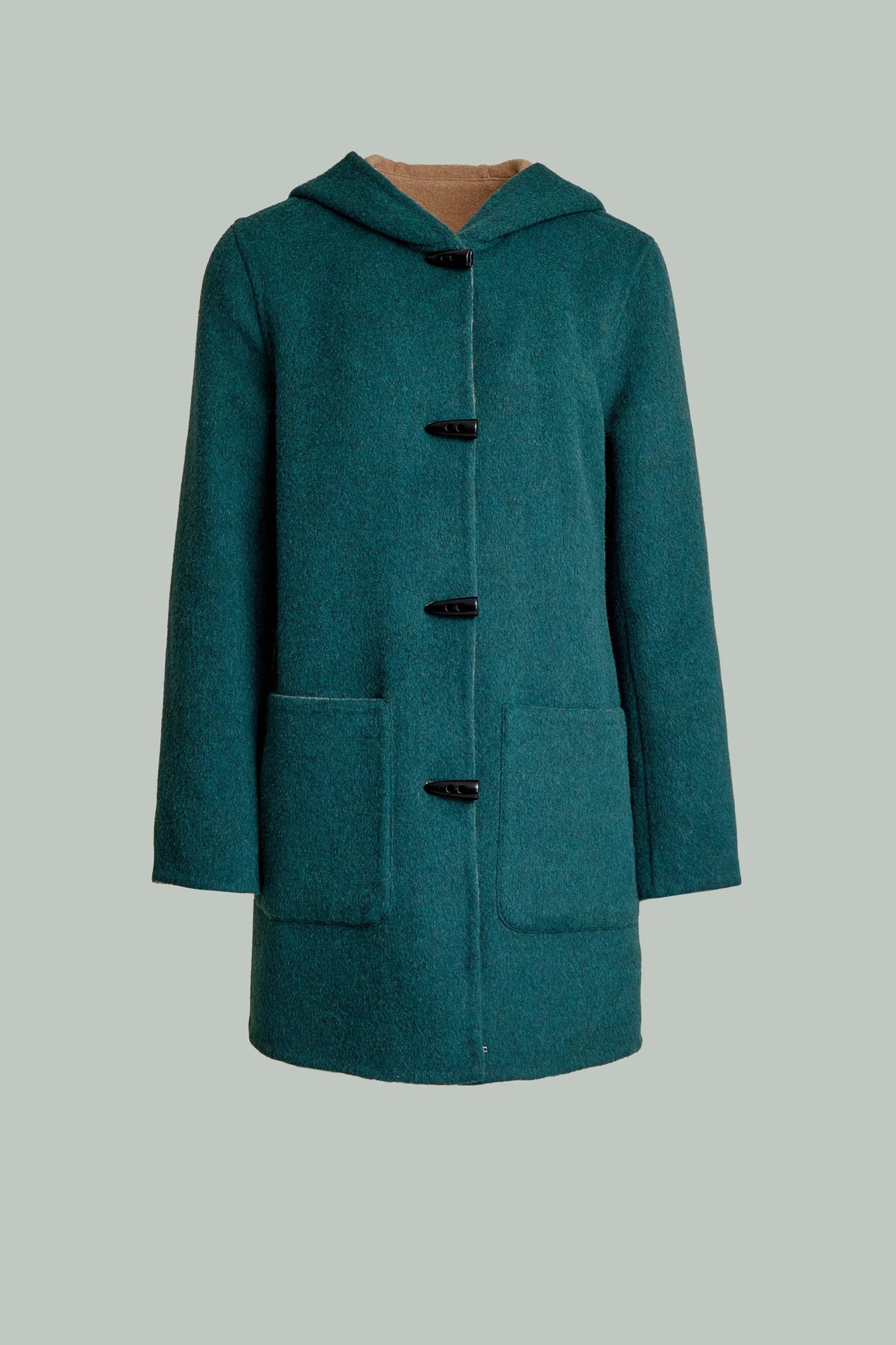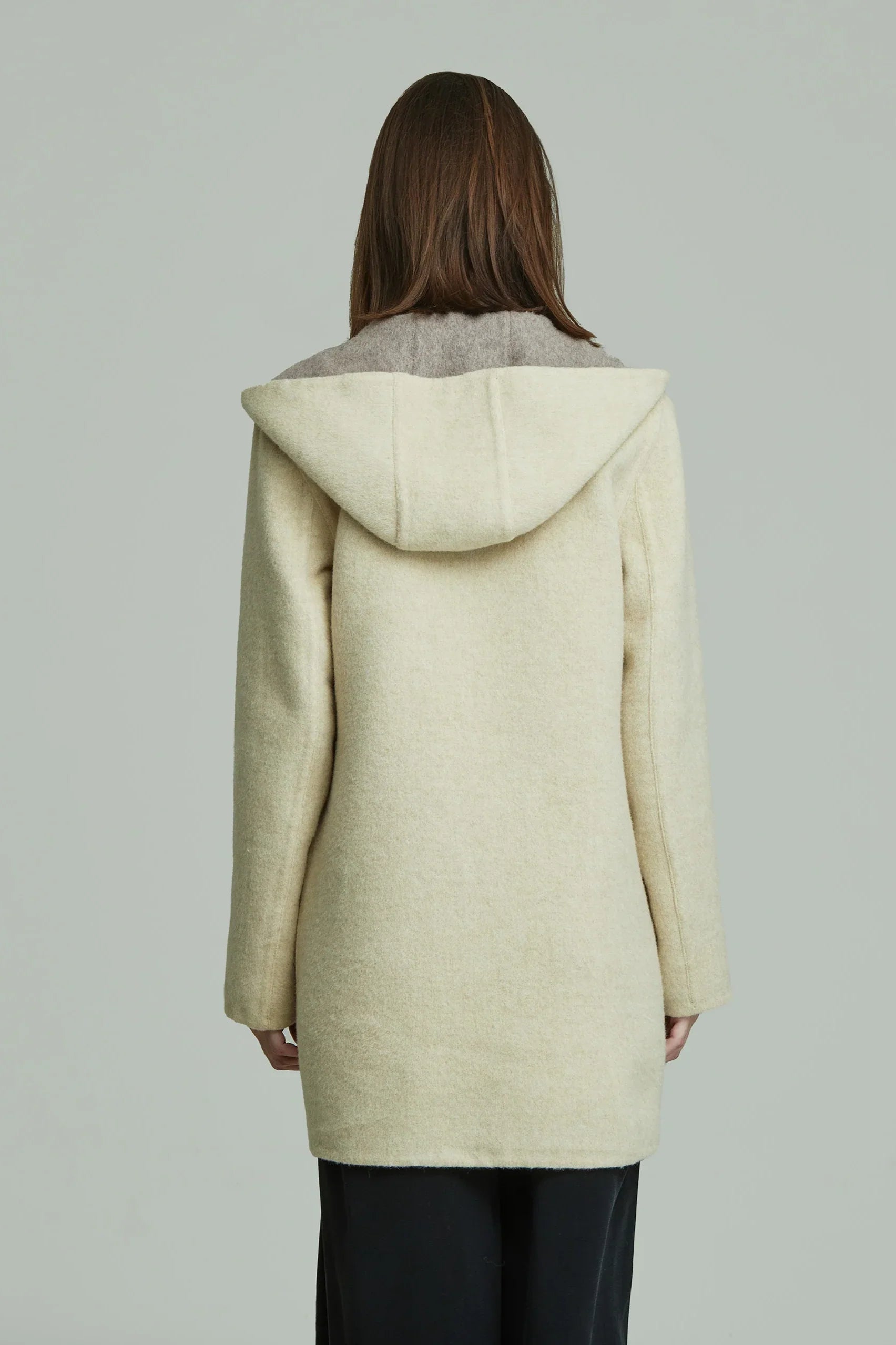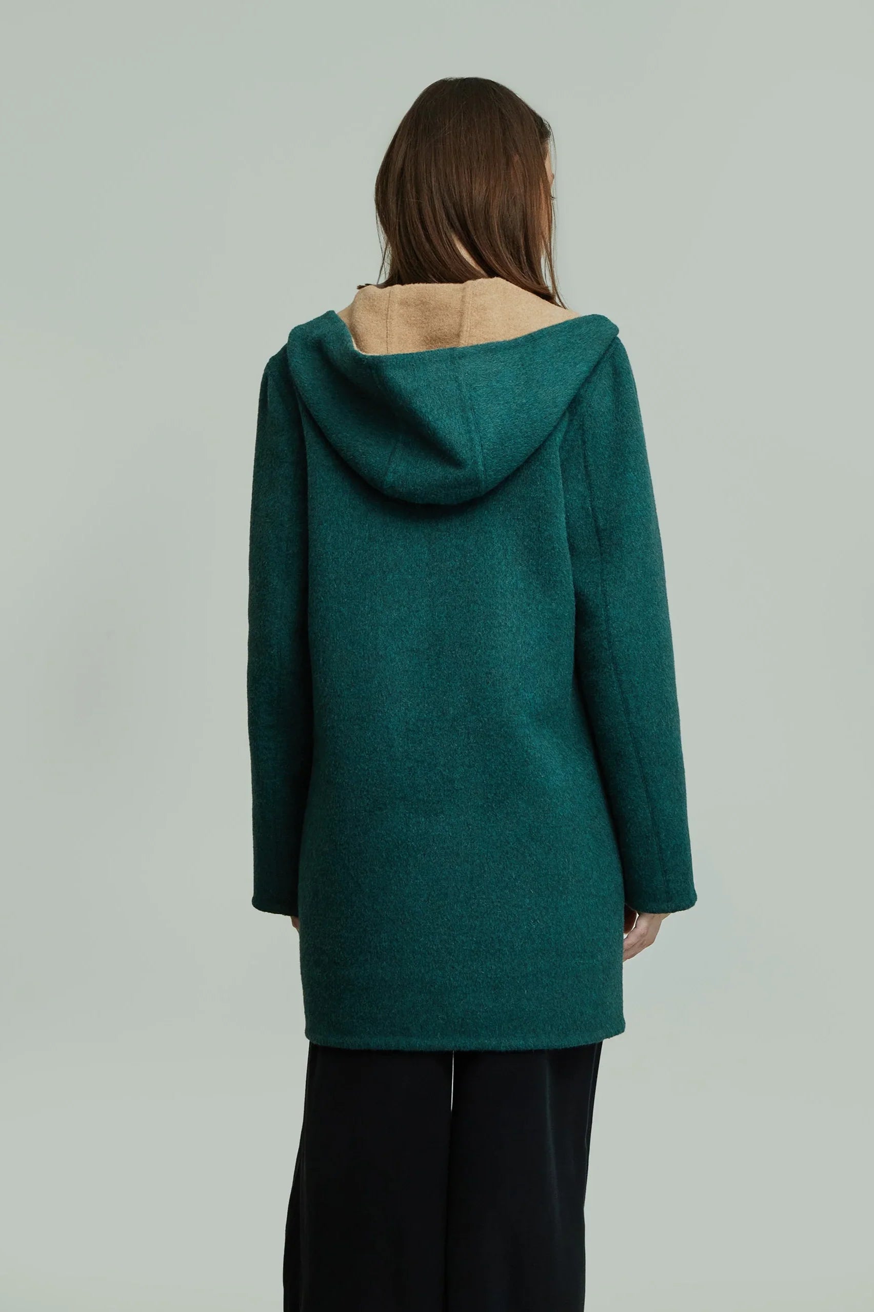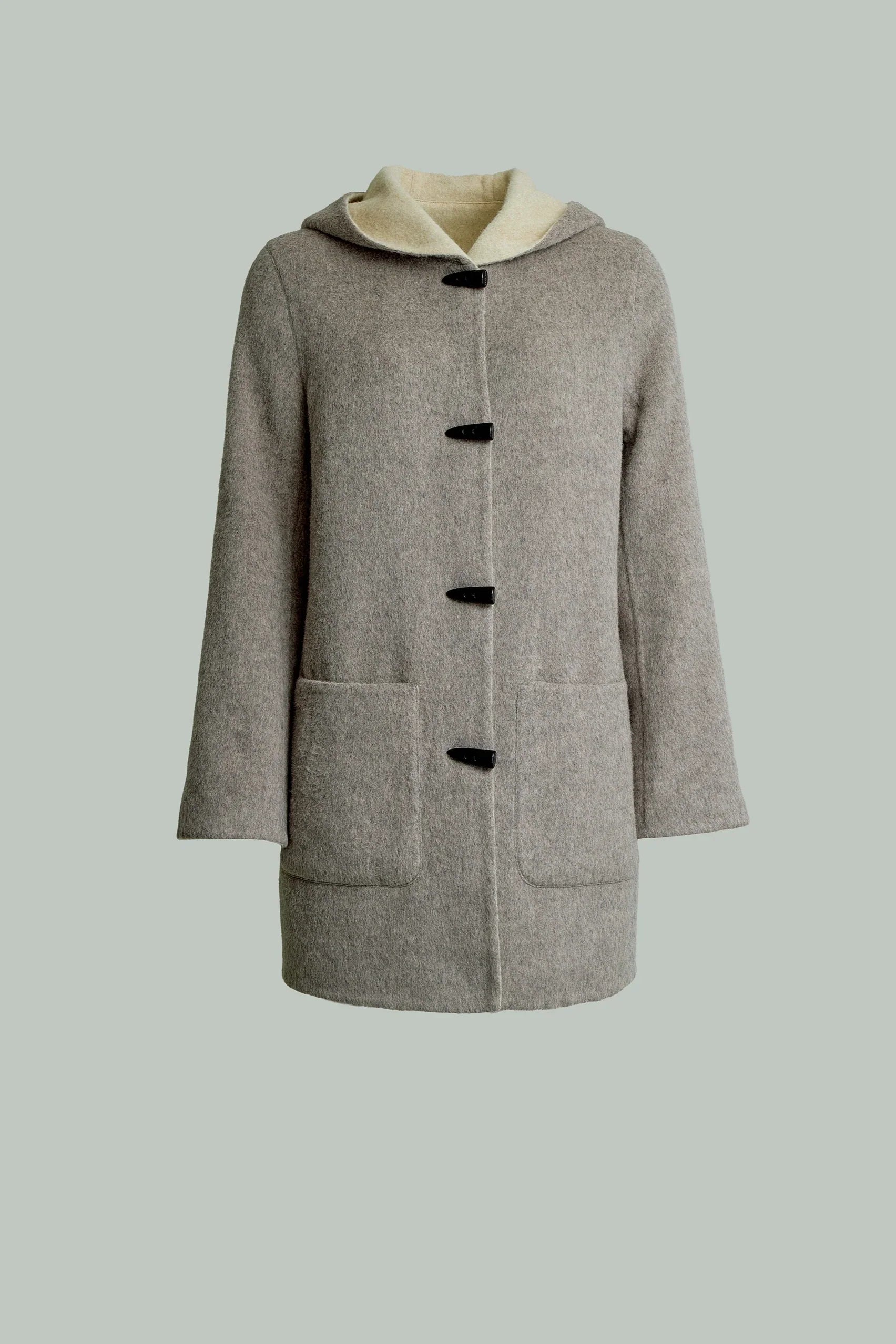 This luxurious and versatile women's reversible hooded coat is a must-have piece for any wardrobe. Crafted from soft, sustainable Baby Alpaca fabric, it provides exceptional warmth, hypoallergenic properties, and unparalleled softness. This coat features beautiful horn buttons and showcases stunning craftsmanship. One of our best-selling Alpaca coats, it has been updated with fresh seasonal colors, offering you two coats in one with its reversible two-tone design. The stylish hood adds extra comfort, making it perfect for any occasion.