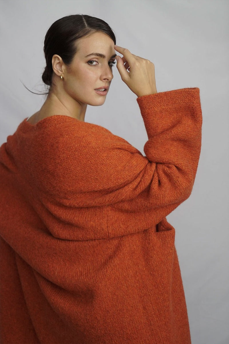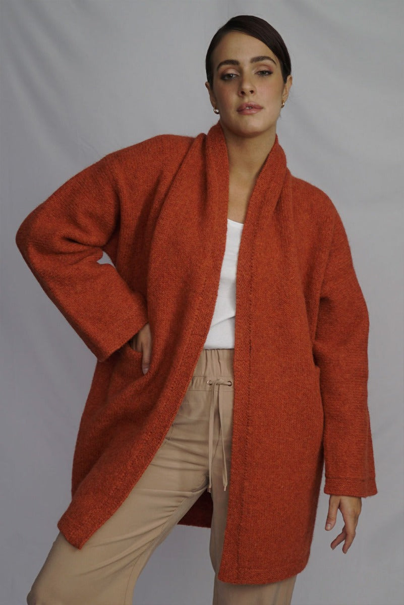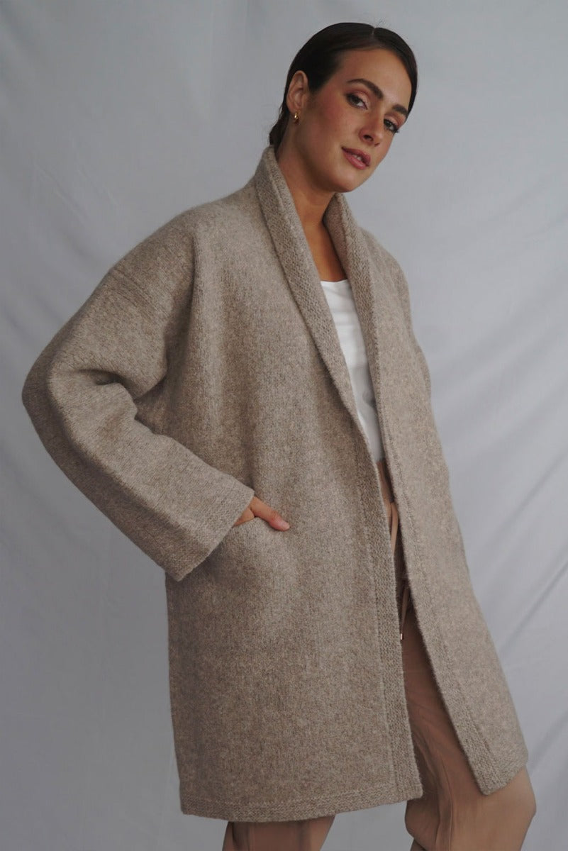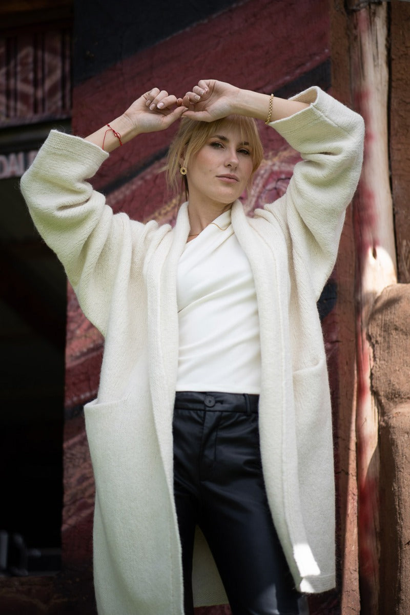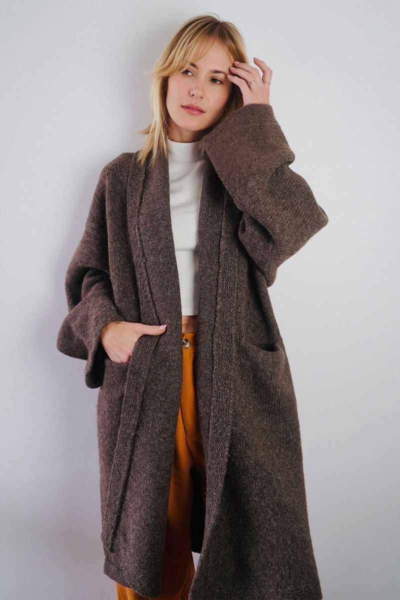 Wrap yourself in the warmth, comfort, and style of the Belen Alpaca Long Cardigan, a versatile knitwear piece designed to keep you warm and stylish throughout the seasons. Crafted from a luxurious alpaca blend, this cardigan/coat is elegant and sophisticated, making it perfect for both casual and dressier occasions.