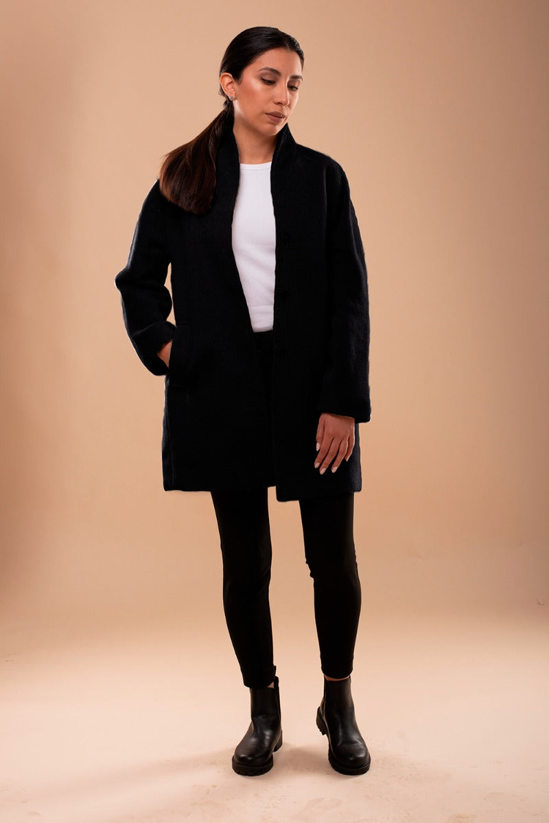 A stunning outerwear piece crafted from the finest Llama wool. This beautiful coat features a sleek finish, hidden snap button closures, a standup collar and side pockets. Lined for added comfort, it is the perfect choice for any occasion.