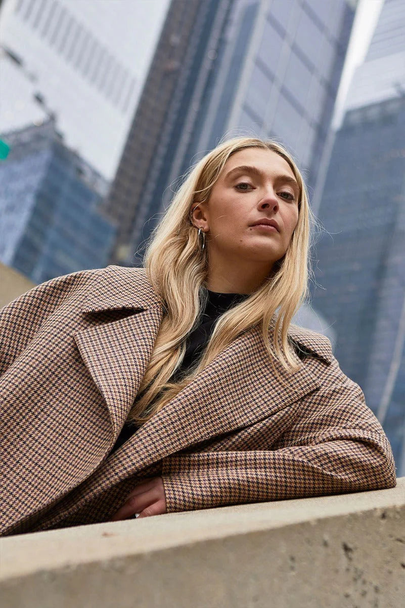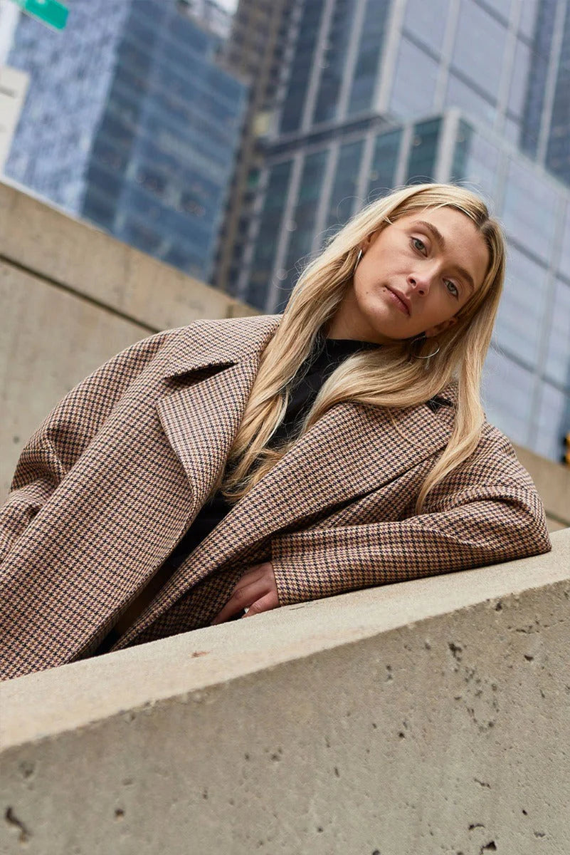 With its oversized lapels, clean lines, and mid-calf length, the Chiara Coat adds a polished touch to any outfit, whether you're heading to the office or strolling through the city. The classic brown-and-black pattern ensures versatility, pairing seamlessly with both neutral tones and bold accents.