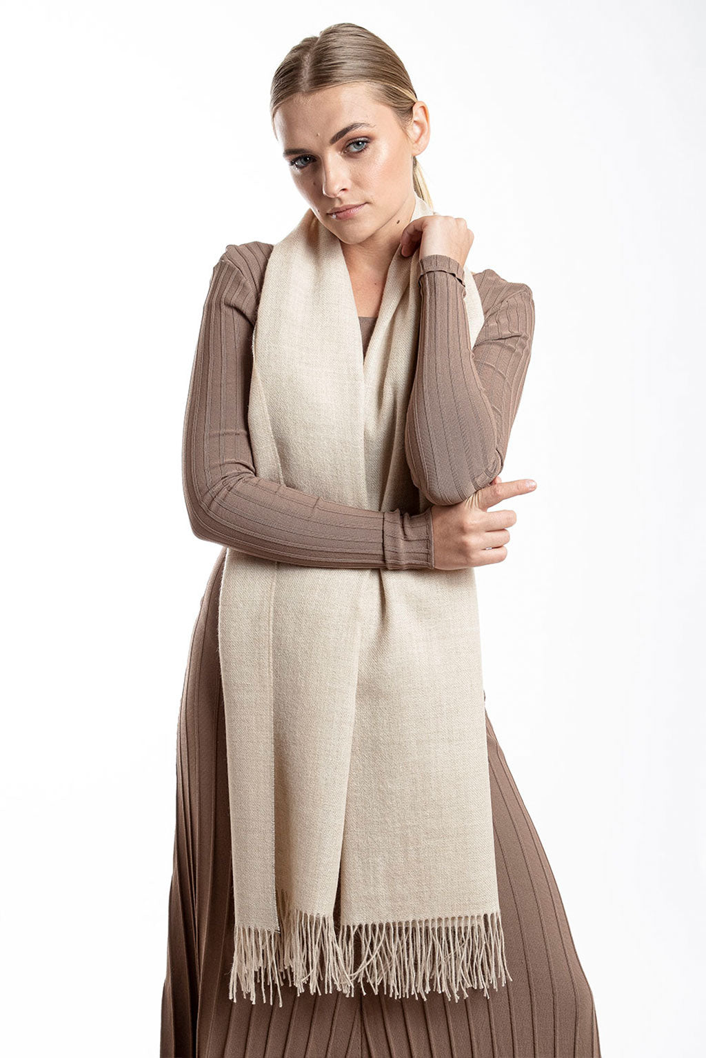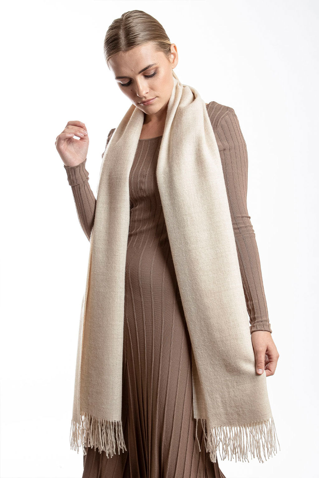 Immerse yourself in the timeless elegance of our Eco Classic Baby Alpaca Shawl. Crafted from eco-friendly baby alpaca wool, this luxurious shawl offers unmatched softness and warmth. Its sleek design and delicate fringes exude sophistication, making it an ideal accessory for any occasion. Whether worn as a shawl or a scarf, it effortlessly enhances your style with its versatile charm.