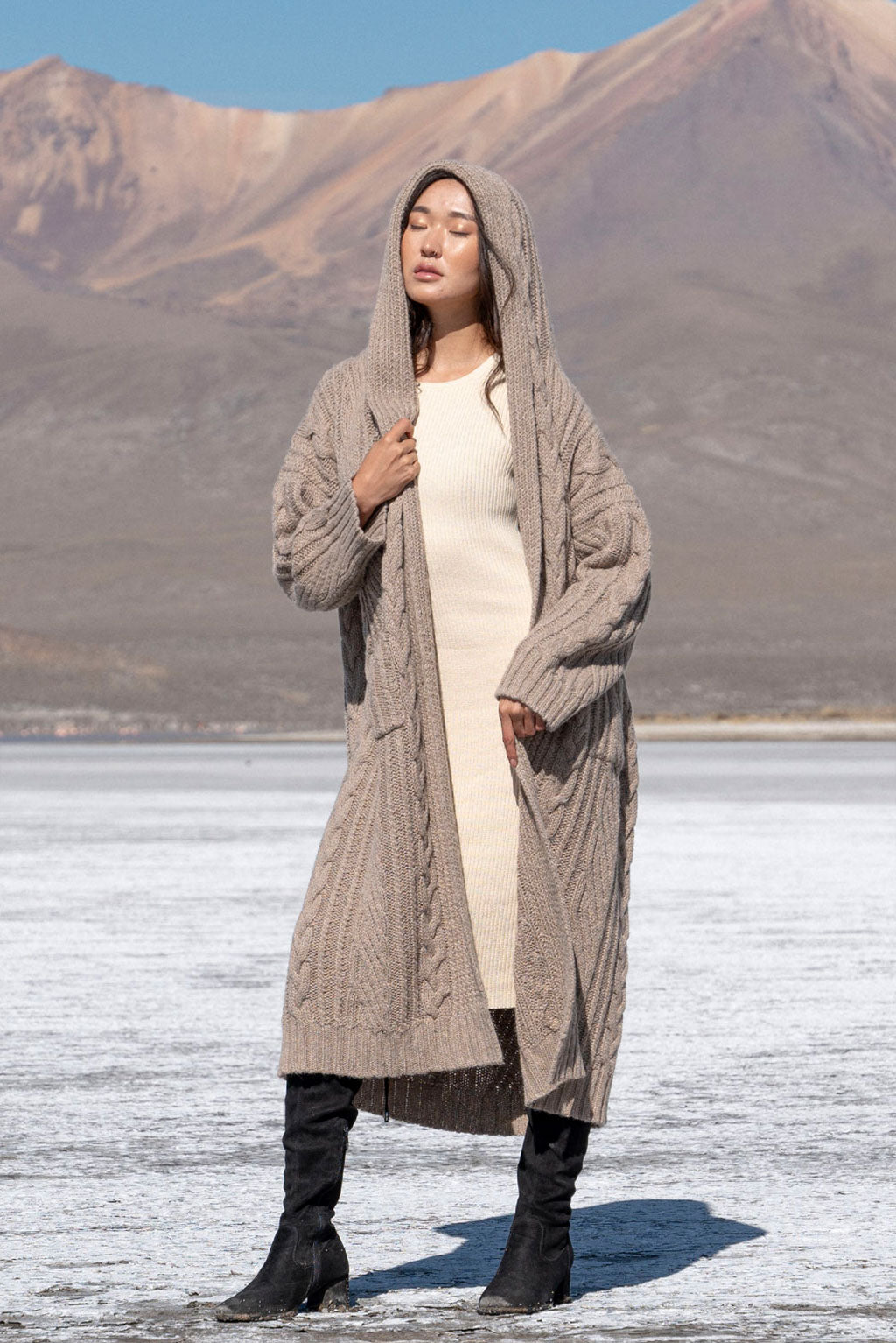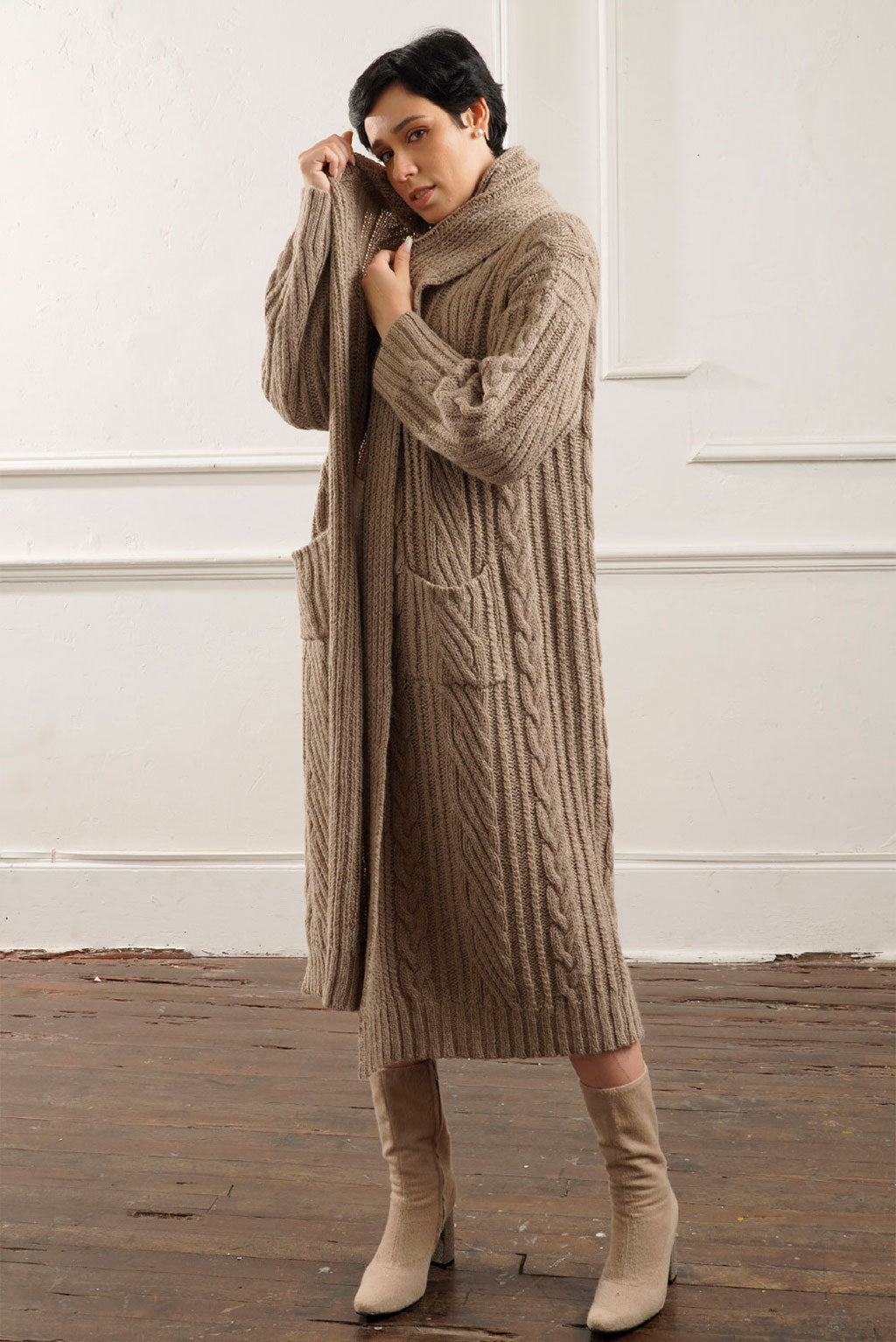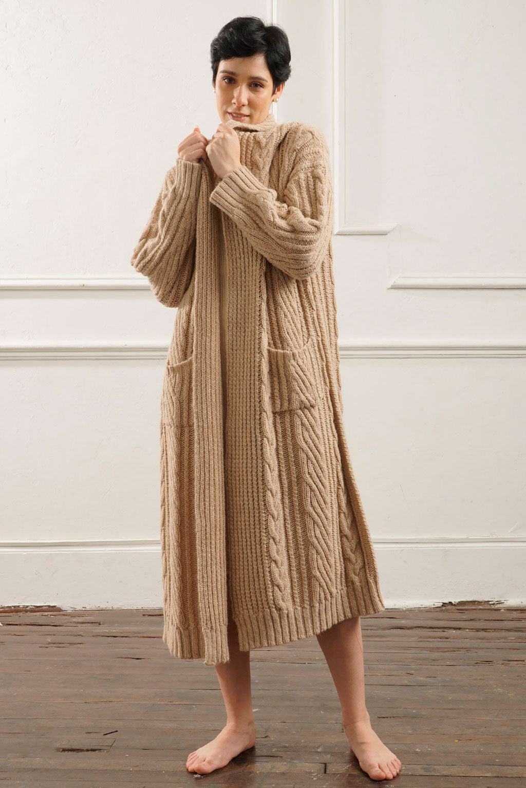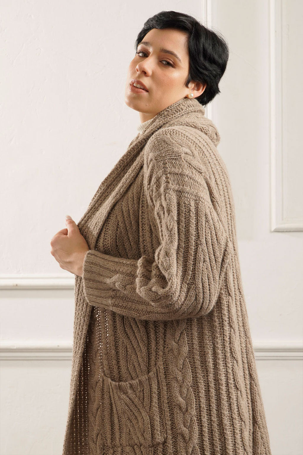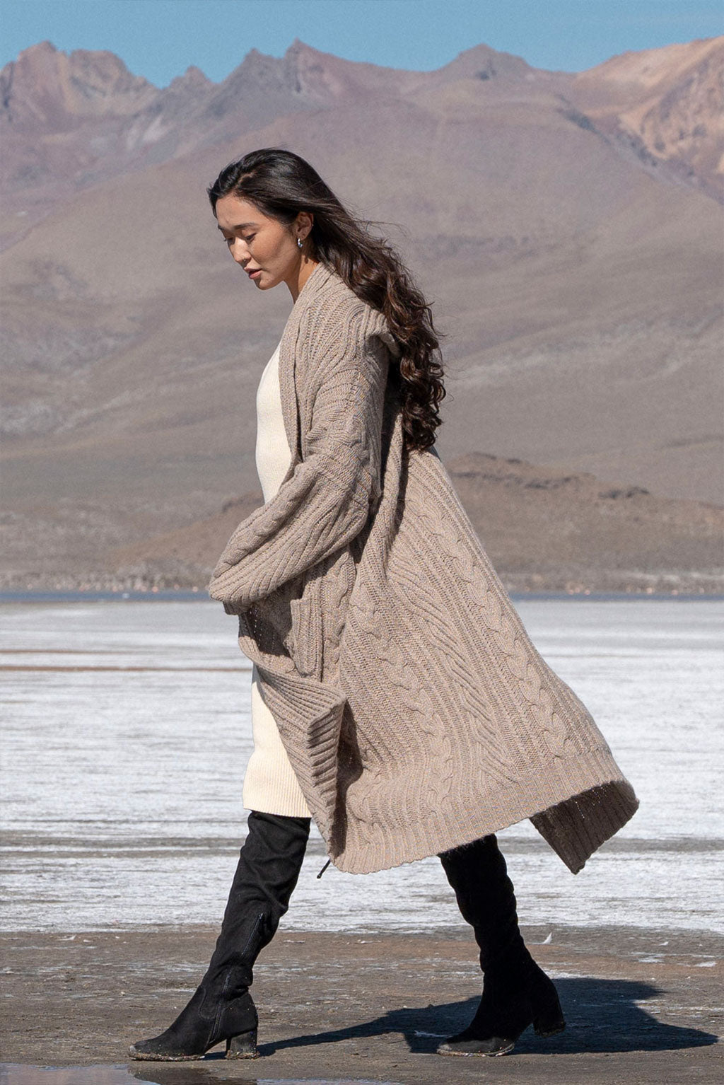 The Kendall Long Cable Knit Cardigan embodies effortless style and warmth. Its flowing silhouette and rich cable design offer a chic, timeless look, perfect for layering. Crafted from 100% Baby Alpaca, this cardigan promises a soft, luxurious feel that will keep you cozy without sacrificing elegance. A versatile addition to any wardrobe.