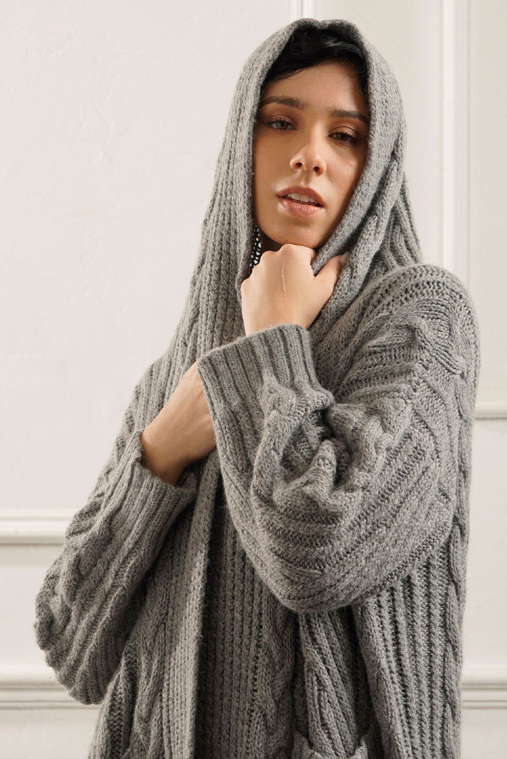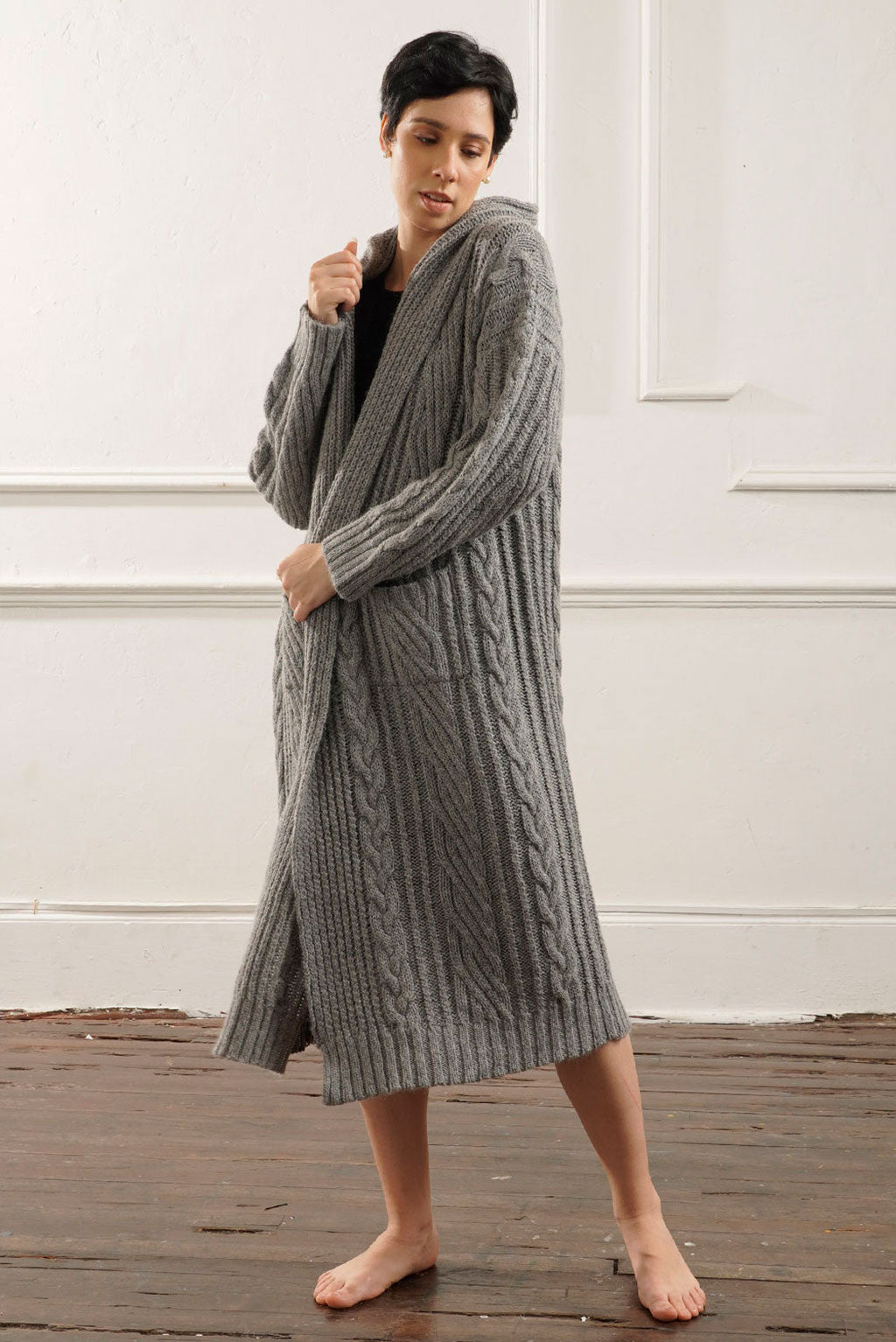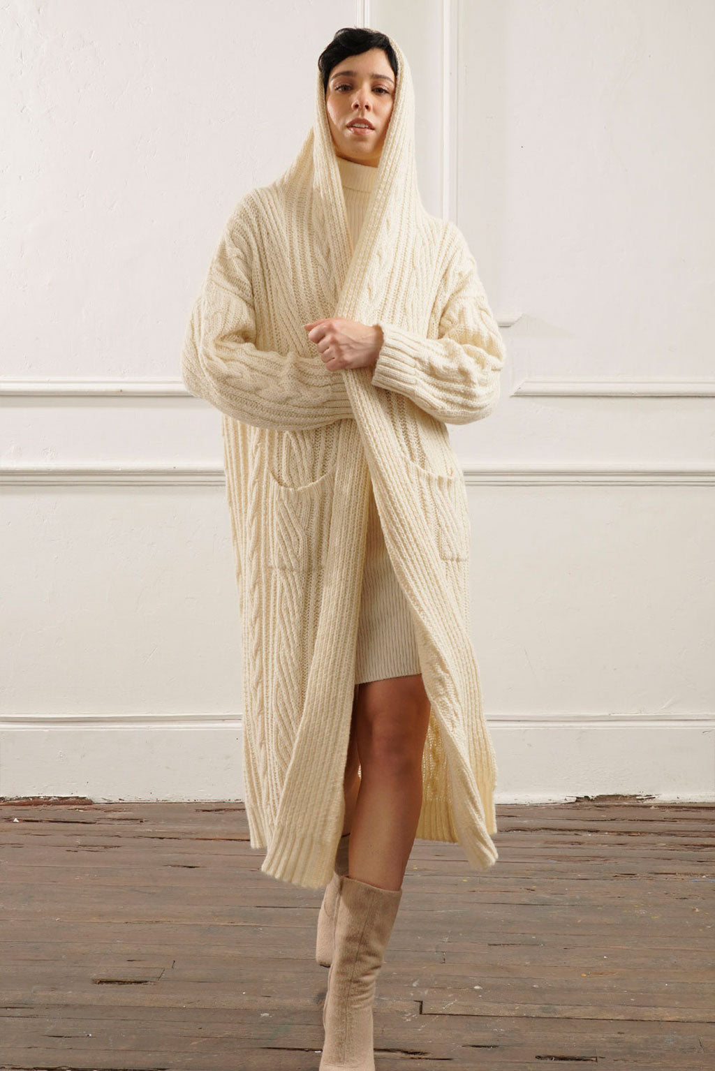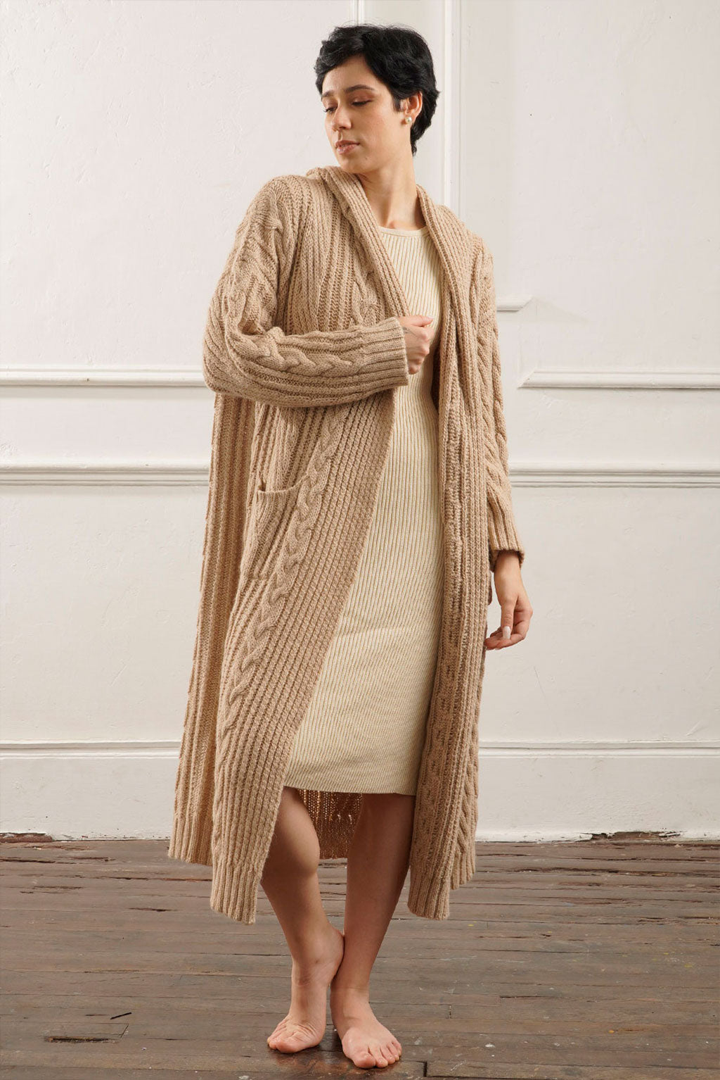 The Kendall Long Cable Knit Cardigan embodies effortless style and warmth. Its flowing silhouette and rich cable design offer a chic, timeless look, perfect for layering. Crafted from 100% Baby Alpaca, this cardigan promises a soft, luxurious feel that will keep you cozy without sacrificing elegance. A versatile addition to any wardrobe.