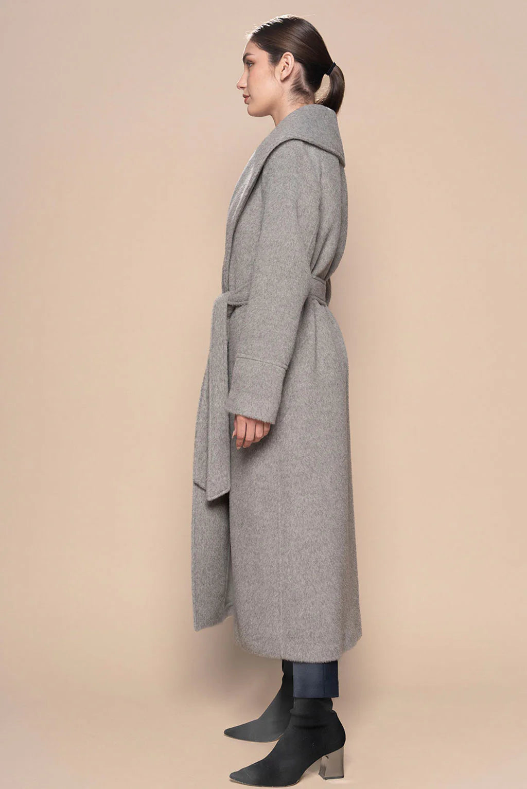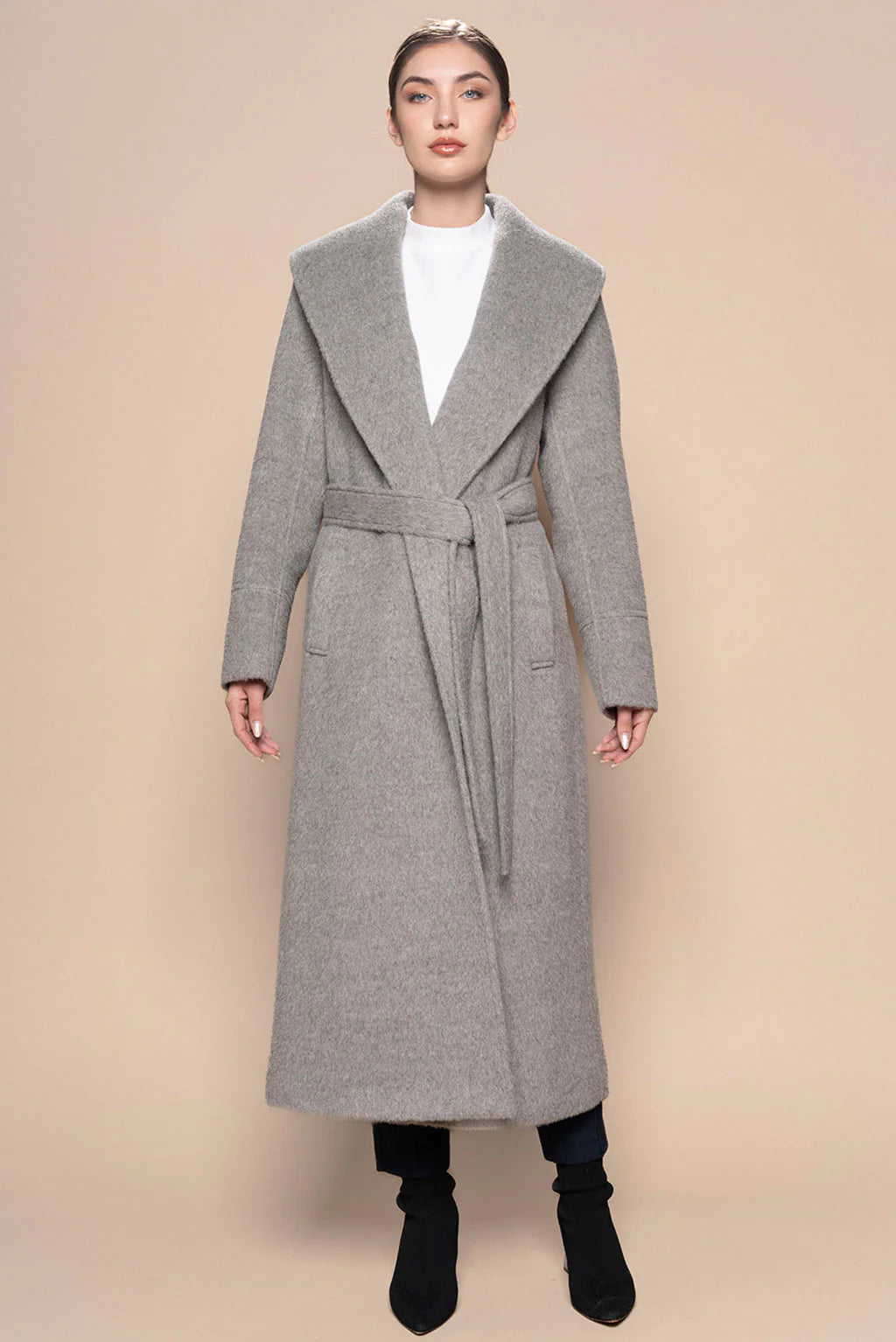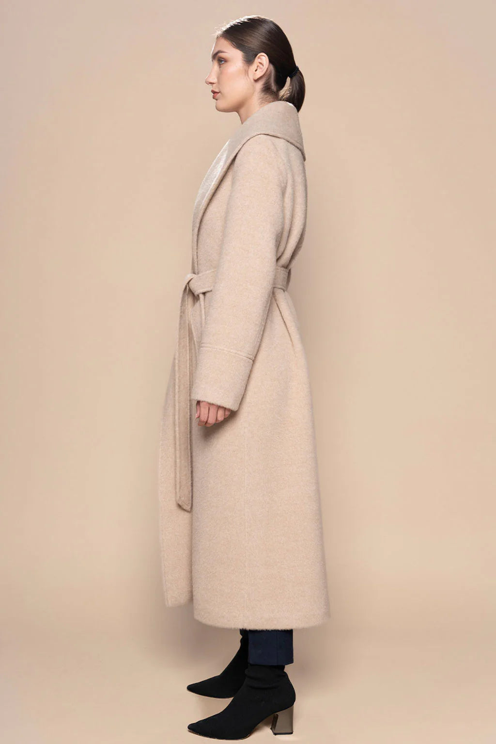 A wide shawl collar, full-length silhouette, and self-tie belt come together to create an elegant, figure-flattering shape. Clean lines and minimalist tailoring make it endlessly versatile, perfect for layering over everything from tailored trousers to casual denim.