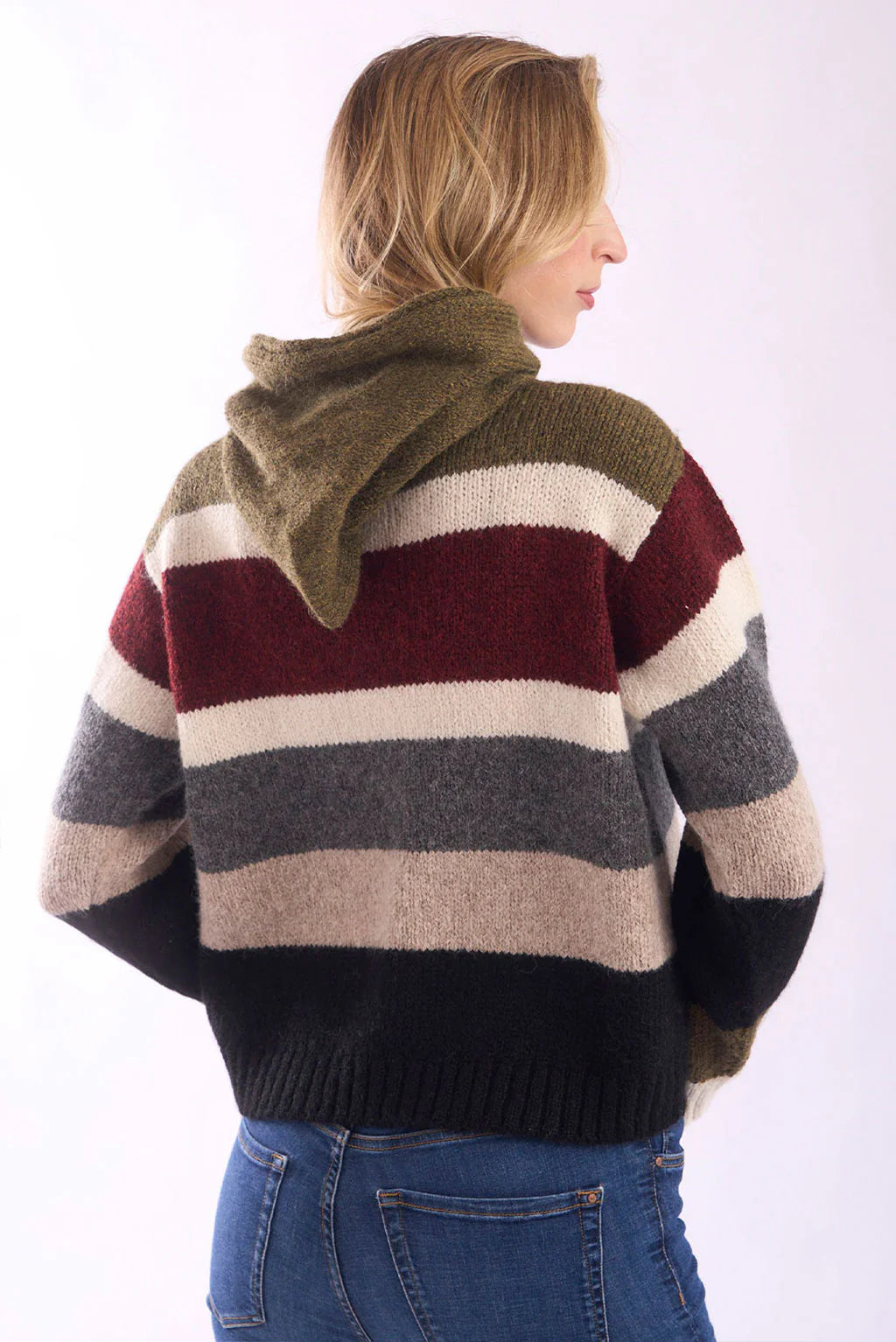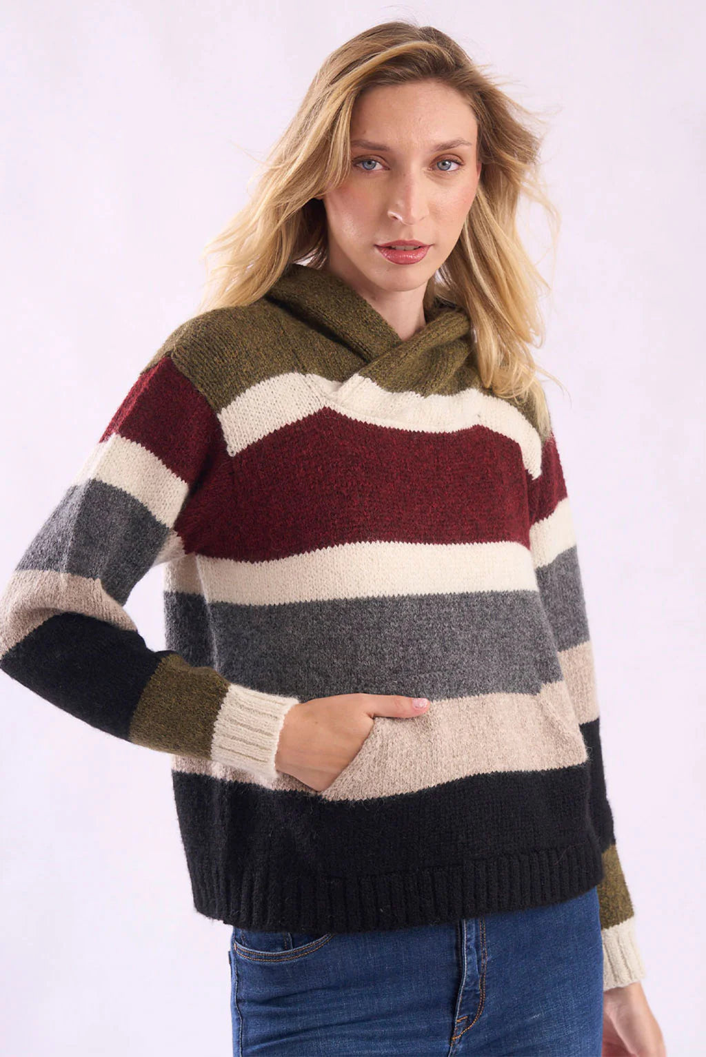 The Mabel Alpaca Hoodie blends modern comfort with timeless knitwear style. Crafted from a luxurious alpaca and merino wool blend. Featuring bold horizontal stripes, a cozy hood, and a relaxed fit, it’s perfect for everyday wear while adding a touch of casual sophistication. A versatile essential designed for effortless layering across seasons.
