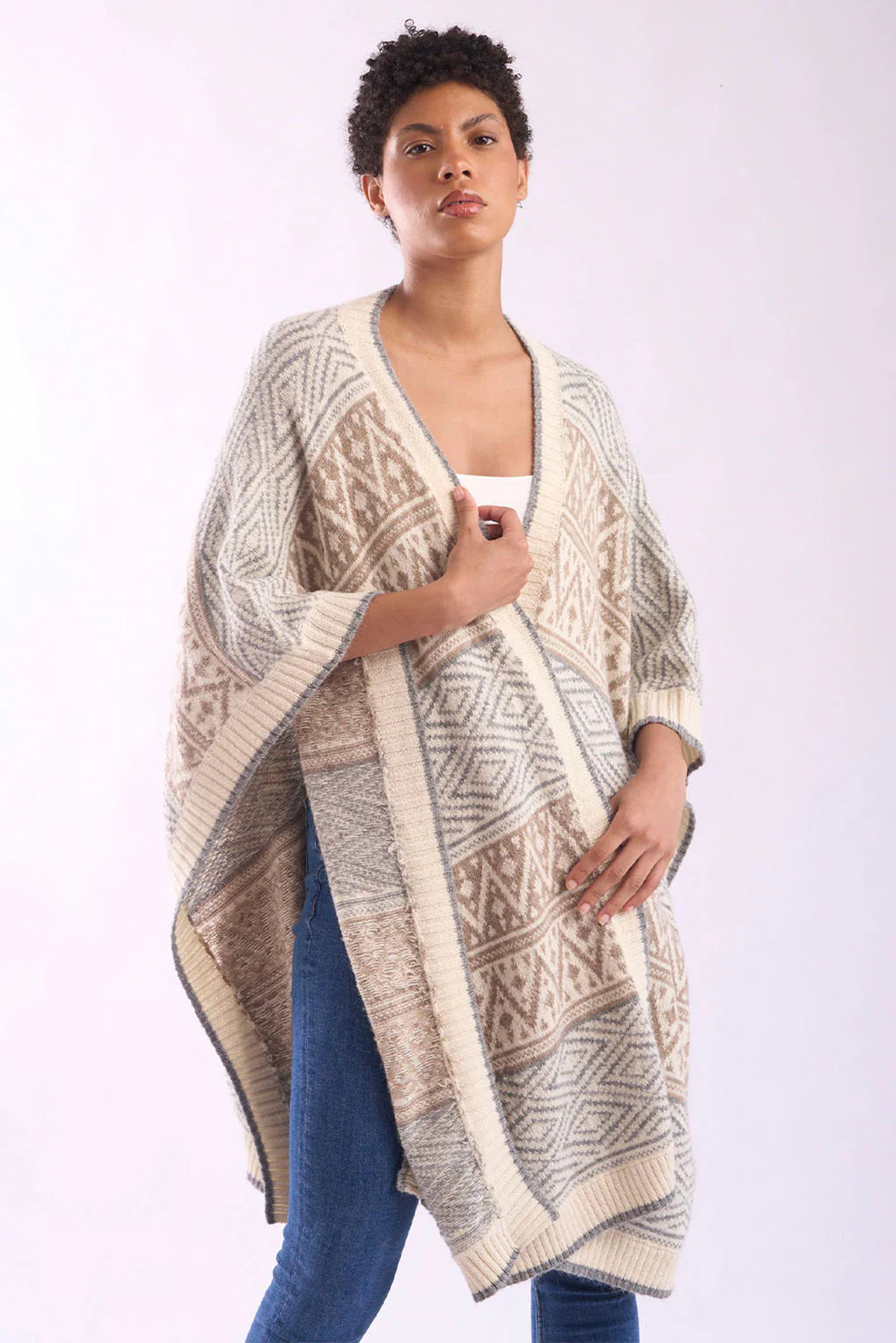 The Myra Baby Alpaca Cape combines artisanal charm with modern sophistication. Designed with a soft drape and an intricate geometric pattern, it offers lightweight warmth and timeless elegance. A versatile one-size piece, it layers effortlessly for both casual and refined looks.
