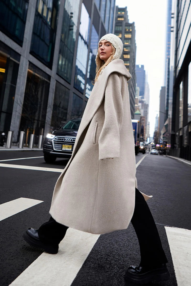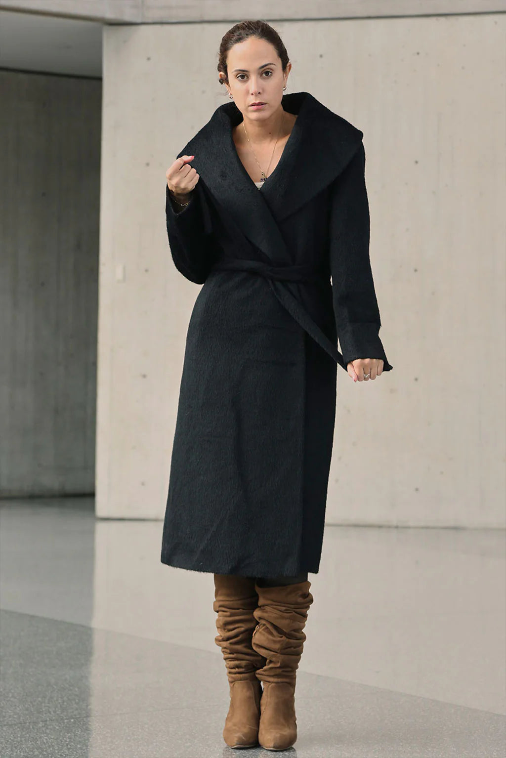 Step into elegance with this oversized long coat featuring classic draped styling and a versatile wide lapel. Crafted from luxurious Suri alpaca—one of the softest and most refined alpaca fibers. The included belt adds a customizable fit and an extra touch of fashion-forward flair. A perfect blend of style and function, crafted with designer expertise.