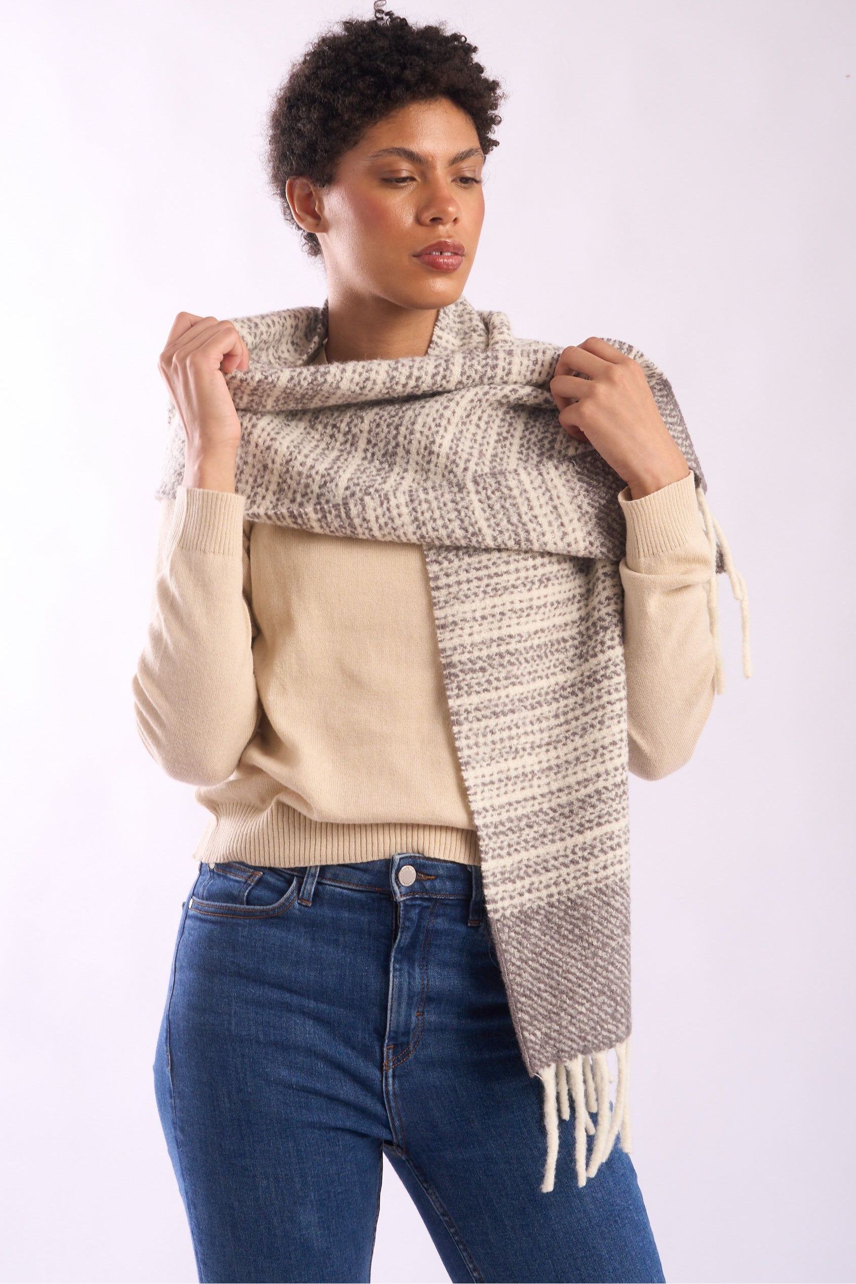 - Stylish striped boucle pattern in grey and ecru