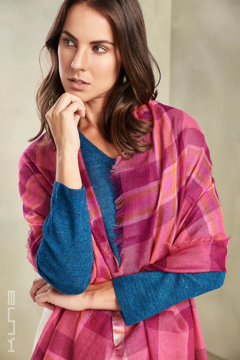 Soft plaid shawl made of baby alpaca and silk. Ideal for every occasion. 79"/78" X 27" inch - 0.26 lbs